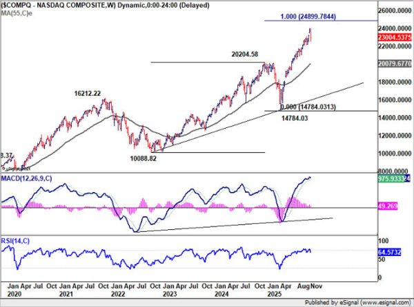 For now, the uptrend from 14,784.03 (Apr low) remains intact. Further rise should still be seen to 100% projection of 10,088.82 (2022 low) to 20,204.58 (2024 high) from 14,783.03 at 24,899.78. But initial resistance should emerge there on overbought condition, or maybe a little higher at 25,000 psychological level, to cap upside on first attempt.
