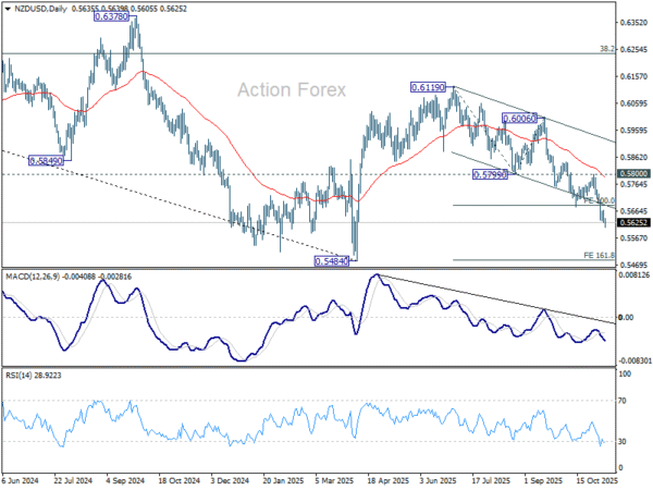 Technically, NZD/USD’s fall from 0.6119 continued last week. The strong break of the falling channel support and 100% projection of 0.6119 to 0.5799 from 0.6006 at 0.5687 both indicate downside acceleration. Near term outlook will now stay bearish as long as 0.5800 resistance holds. Next target is the support zone between 0.5484 low and 161.8% projection at 0.5490.