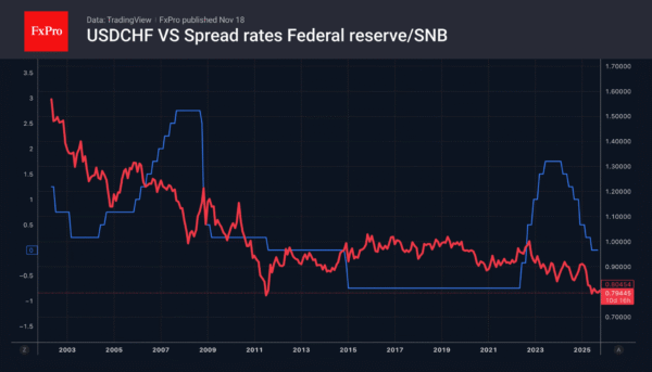 Meanwhile, the White House has finally lowered tariffs on Swiss goods from 39% to 15%. Expectations surrounding this event have made the franc the main favourite on the Forex market. However, according to Commerzbank, the USDCHF peak is unlikely to be too deep. Most of the good news is already priced in. The future of the pair will depend on the interest rate differential between the Fed and the Swiss National Bank.