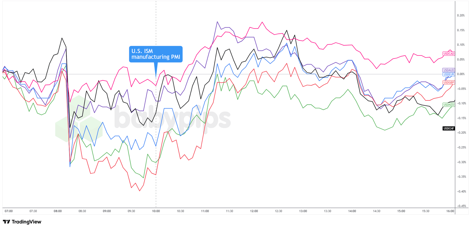 The dollar, which had already been pressured by the soft ADP payrolls report, bounced from its intraday lows after the ISM headline PMI came in stronger than expected.