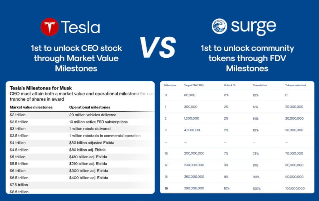The founding team behind Surge — composed of experienced traders and quantitative analysts with deep backgrounds in both traditional finance and crypto markets — designed Surge Launch v1.0 with a novel approach. Under this model, 90% of insider tokens, including those allocated to teams, advisors, and early investors, remain locked until the project hits specific Fully Diluted Valuation (FDV) targets. The system gates token unlocks behind 19 distinct FDV milestones, which can also include technical achievements like model accuracy thresholds, user growth metrics, or validated use case deployments.