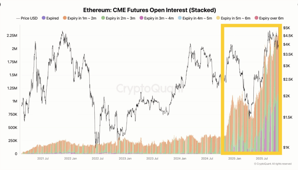 CryptoQuant and exchange data point to a rise in institutional interest. CME futures open interest for ETH has climbed, suggesting larger players are setting positions ahead of a potential price move.