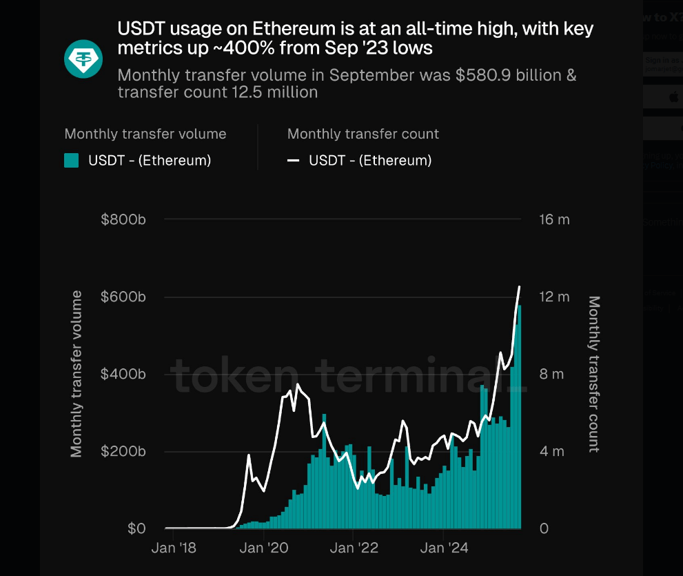 USDT usage on Ethereum is at an all-time high, with key metrics up ~400% from Sep ’23 lows.