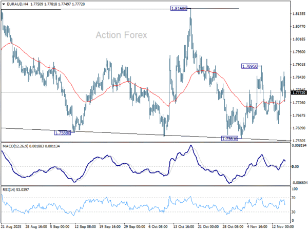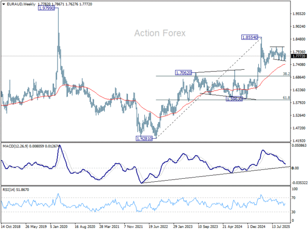 EUR/AUD stayed in range of 1.7561/7895 last week and the near term outlook is mixed. Initial bias stays neutral this week first. On the downside, break of 1.7561 support will revive the bearish case that corrective pattern from 1.8554 is in the third leg, and target 1.7245 support. On the upside, though, above 1.7895 will resume the rebound from 1.7561 to 1.8160 resistance.