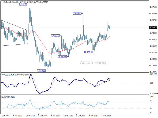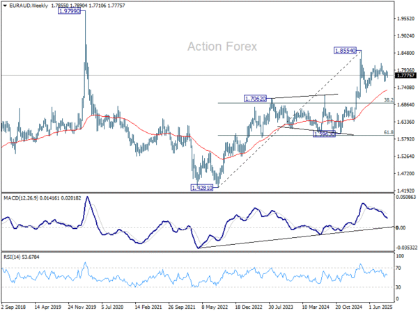 In the bigger picture, price actions from 1.8554 medium term top are seen as a corrective pattern. Deeper fall could be seen as the pattern extends, but downside should be contained by 38.2% retracement of 1.4281 (2022 low) to 1.8554 at 1.6922 to bring rebound. Uptrend from 1.4281 is expected to resume at a later stage.
