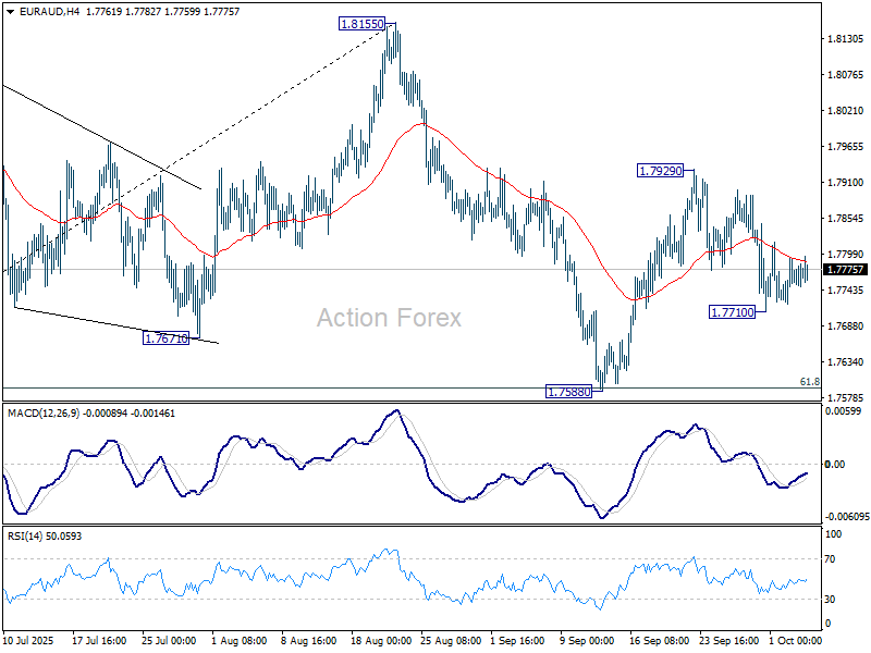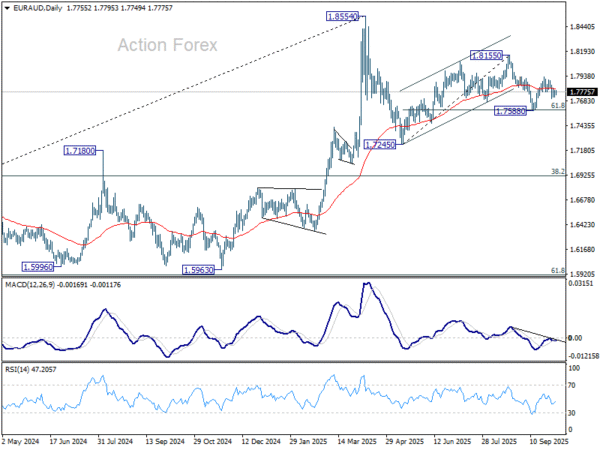 EUR/AUD gyrated lower last week but downside was contained well above 1.7588 support. Initial bias remains neutral this week first. On the upside, break of 1.7929 will resume the rebound from 1.7588 to retest 1.8155 high. On the downside, however, sustained break of 61.8% retracement of 1.7245 to 1.8155 at 1.7593 will bring deeper fall to 1.7245 resistance, as part of the corrective pattern from 1.8554 high.