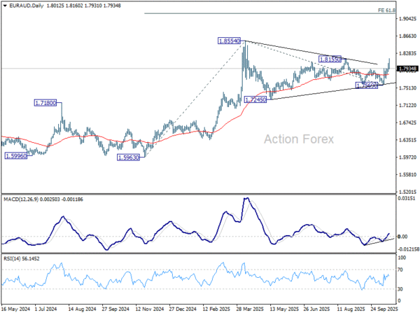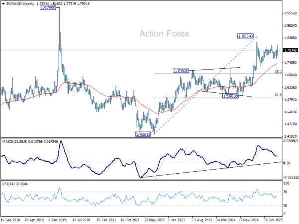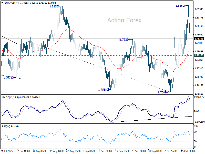 EUR/AUD’s strong rally last week suggests that corrective pattern from 1.8554 has completed with three waves to 1.7569. Nevertheless, since a temporary top was formed at 0.8160 after first rejection by 1.8155 resistance, initial bias is turned neutral this week first. On the upside, sustained break of 1.8155 will affirm this bullish case and bring retest of 1.8554 high next. However, break of 1.7818 will dampen this bullish view and turn focus back to 1.7569 support instead.