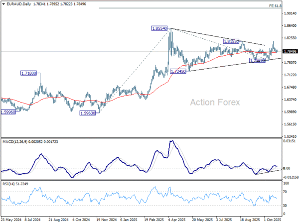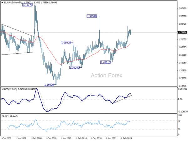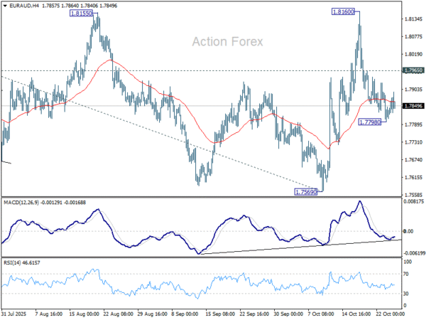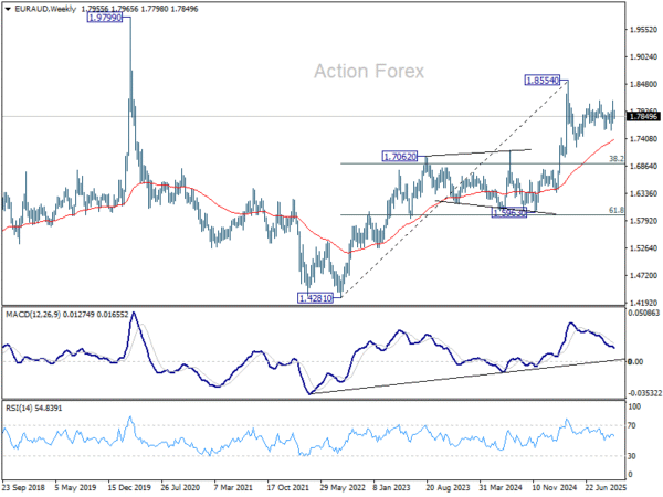 EUR/AUD’s pullback was a little deeper than expected last week, but it nonetheless recovered after hitting 1.7798. Initial bias remains neutral first. On the upside, break of 1.7965 minor resistance will bring retest of 1.8160. Firm break there will solidify the case that larger up trend is resuming. However, below 1.7798 will dampen this week and suggest that corrective pattern from 1.8554 is still extending. In this case, deeper fall should be seen to 1.7569 support instead.