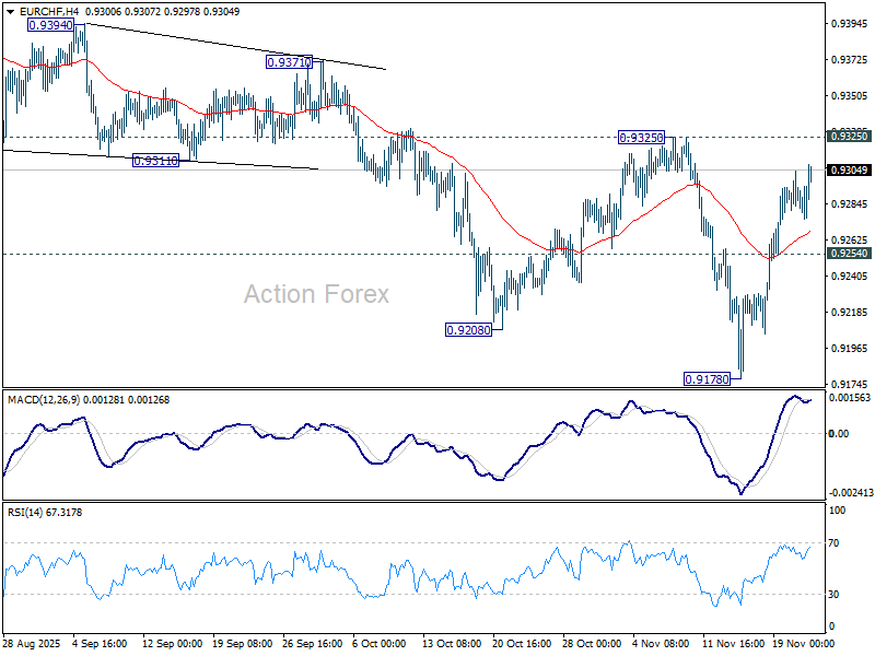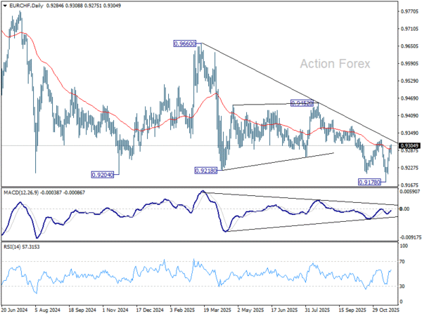 EUR/CHF’s strong rebound last week indicates short term bottoming at 0.9178. Still, with 0.9325 resistance intact, outlook remains bearish and another fall is still in favor. On the downside, below 0.9254 minor support will bring retest 0.9178 support. However, considering bullish convergence condition in D MACD, decisive break of 0.9325 will argue that whole fall from 0.9660 has completed. Strong rally should then be seen towards 0.9452 resistance.