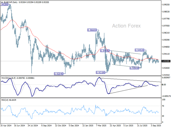 EUR/CHF’s recovery was limited by 0.9354 resistance last week as sideway trading continued. Initial bias stays neutral this week first. Risk is mildly on the downside as long as 0.9354 resistance holds. Break of 0.9311 will resume the fall from 0.9452 to 0.9265 support. Nevertheless, firm break of 0.9354 will turn bias back to the upside for 0.9452 resistance instead.