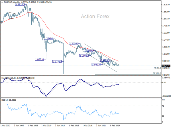 In the bigger picture, outlook remains bearish with EUR/CHF staying well inside long term falling channel after multiple rejection by 55 W EMA (now at 0.9395). Firm break of 0.9204 will resume the whole down trend from 1.2004 (2018 high). Next target is 61.8% projection of 1.1149 to 0.9407 from 0.9928 at 0.8851. Break of 0.9452 resistance is needed to be the first sign of medium term bottoming.