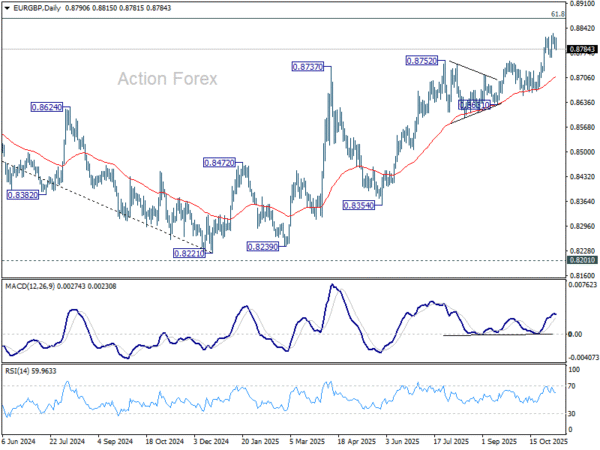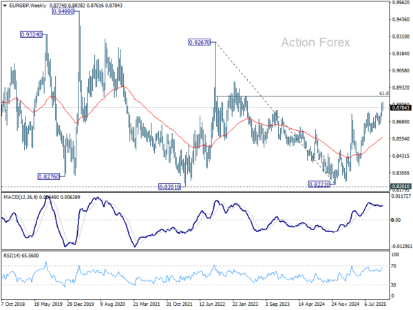 In the bigger picture, rise from 0.8221 medium term bottom is still seen as a corrective move. Upside should be limited by 61.8% retracement of 0.9267 to 0.8221 at 0.8867. Firm break of 0.8654 support will be the first sign that this corrective bounce has completed. However, decisive break of 0.8867 will suggest that EUR/GBP is already reversing whole decline from 0.9267 (2022 high).