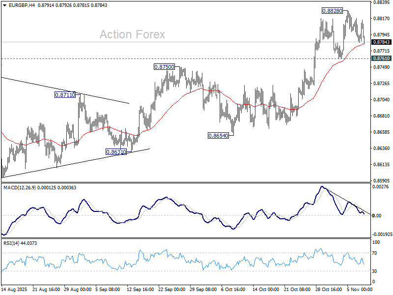 EUR/GBP edged higher to 0.8828 last week but retreated again. Initial bias stays neutral this week for more consolidations. Further rally is expected as long as 0.8761 support holds. On the upside, break of 0.8828 will resume the whole rally from 0.8221 and target 0.8867 fibonacci level. Firm break there will carry larger bullish implications. However, considering bearish divergence condition in 4H MACD, decisive break of 0.8761 will confirm short term topping, and bring deeper fall to 55 D EMA (now at 0.8708).