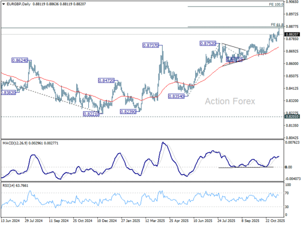 In the bigger picture, rise from 0.8221 medium term bottom is still seen as a corrective move. Upside should be limited by 61.8% retracement of 0.9267 to 0.8221 at 0.8867. Sustained trading below 55 W EMA (now at 0.8571) should confirm that this corrective bounce has completed. However, decisive break of 0.8867 will suggest that EUR/GBP is already reversing whole decline from 0.9267 (2022 high). That should pave the way back to 0.9267.
