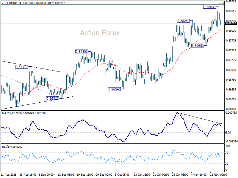 EUR/GBP’s rally resumed to 0.8663 last week but retreated since then. Initial bias is turned neutral this week first. Considering bearish divergence condition in 4H MACD, firm break of 0.8765 support will confirm short term topping. Deeper fall should then be seen back to 55 D EMA (now at 0.8725) even still as a correction. On the upside, however, sustained trading above 0.8867 fibonacci level will carry larger bullish implications. Next near term target will be 100% projection of 0.8354 to 0.8752 from 0.8631 at 0.9029.