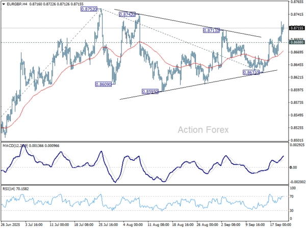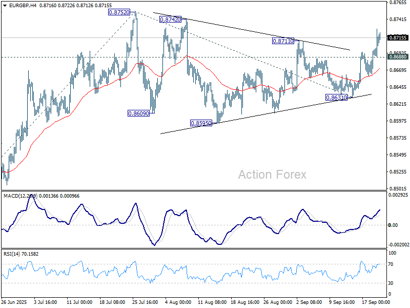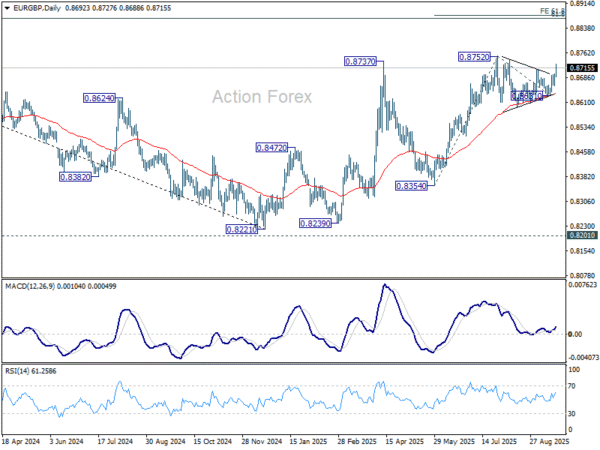 EUR/GBP surged through 0.8711 resistance last week. One interpretation is that consolidations pattern from 0.8752 has completed as a triangle at 0.8631. Initial bias remains on the upside this week for retesting 0.8752 high. Firm break there will resume larger rally to 61.8% projection of 0.8354 to 0.8752 from 0.8631 at 0.8877, which is close to 0.8867 fibonacci level. On the downside, though, below 0.8688 minor support will dampen this view and turn bias neutral first.