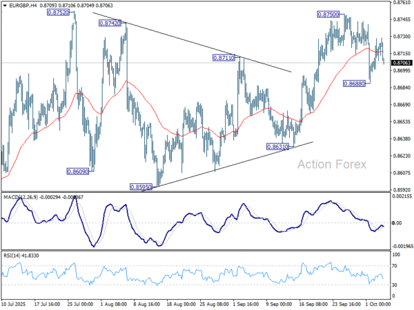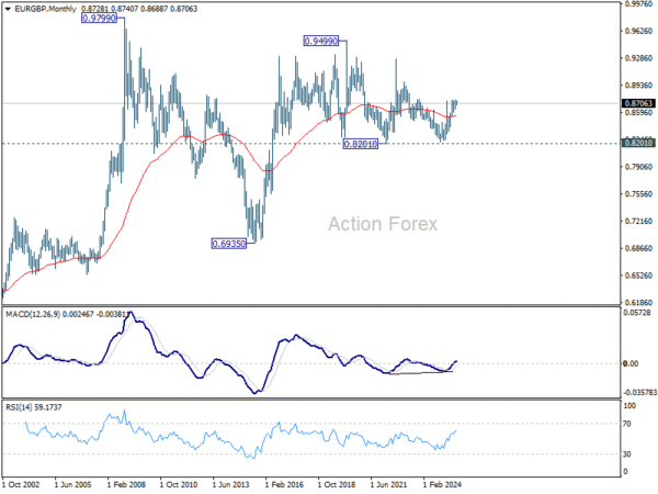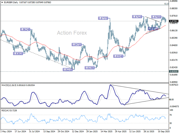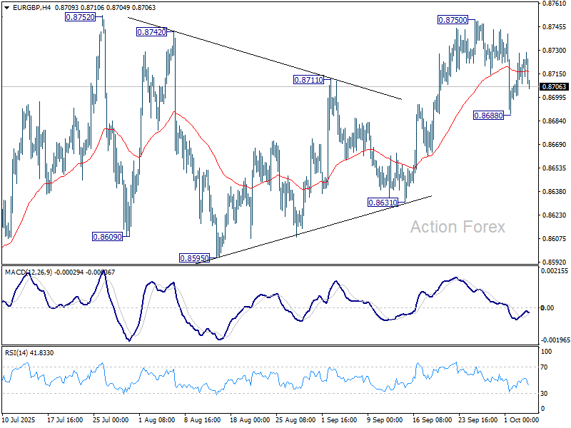 EUR/GBP stayed in consolidations below 0.8750 last week and outlook is unchanged. Initial bias stays neutral this week first. On the downside, break of 0.8688 will extend the fall to 0.8631 support. Decisive break there will indicate near term bearish reversal. On the upside, though, above 0.8750 will resume the larger rally towards 0.8867 fibonacci level.