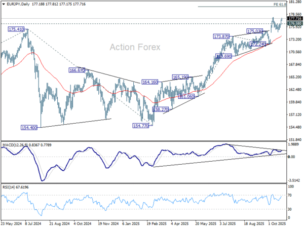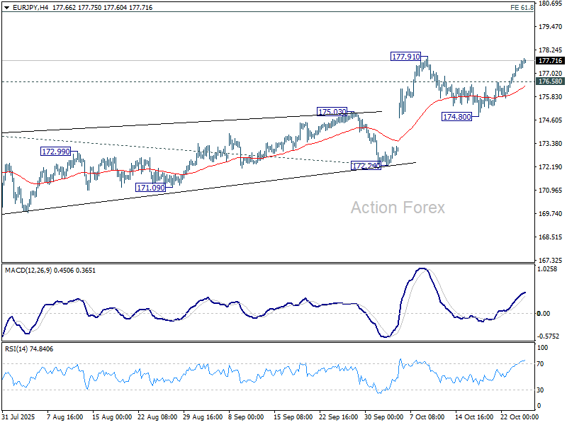 EUR/JPY’s extended rebound last week suggests that pullback from 177.91 has completed at 174.80 already. Initial bias stays on the upside this week. Firm break of 177.91 will confirm larger up trend resumption, and target 61.8% projection of 161.06 to 173.87 from 172.24 at 180.15 next. On the downside, though, below 176.58 will turn bias to the downside and extend the corrective pattern form 177.91 with another falling leg.