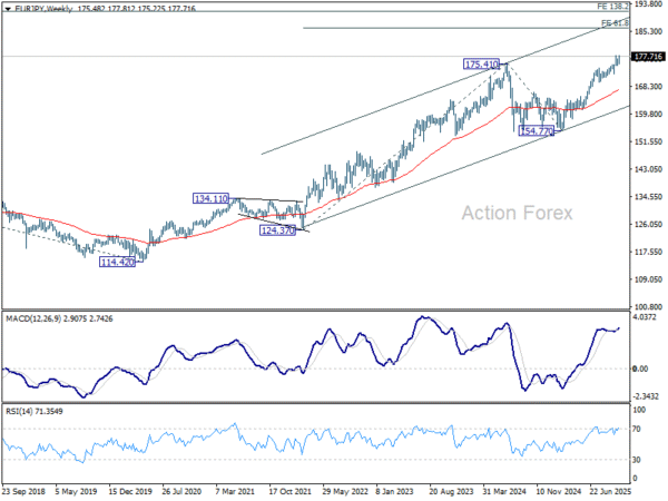 In the bigger picture, up trend from 114.42 (2020 low) is in progress and should target 61.8% projection of 124.37 to 175.41 from 154.77 at 186.31. Firm break of 172.24 support will suggests that it has turned into consolidations again. But still, outlook will continue to stay bullish as long as 55 W EMA (now at 167.16) holds, even in case of deep pullback.