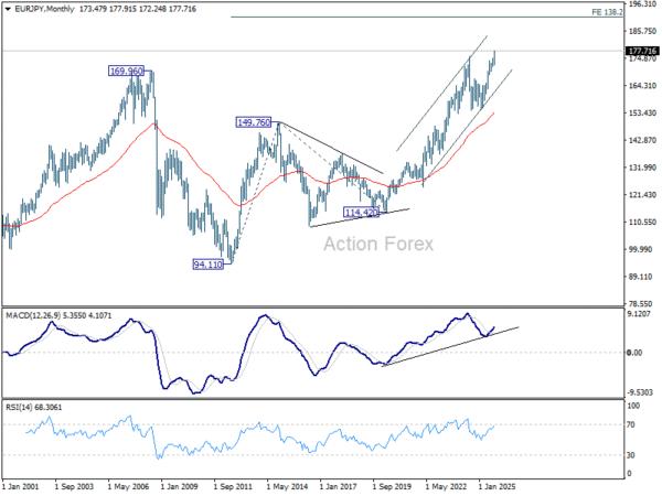 In the long term picture, up trend from 94.11 (2021 low) is in progress. Next target is 138.2% projection of 94.11 to 149.76 (2014 high) from 114.42 (2020 low) at 191.32. This will remain the favored case as long as 154.77 support holds.