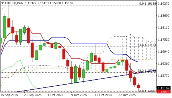 Stronger dollar on the recent Fed’s hawkish cut, which eased bets for December rate cut, continue to pressure Euro, as the US central bank is likely to miss again key report from the labor sector due to prolonged government closure.