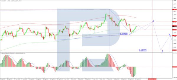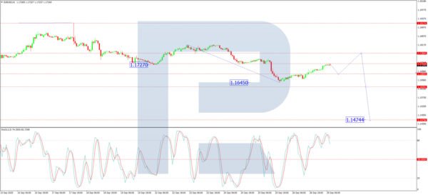The H1 chart shows the completion of a decline to 1.1645, followed by the formation of a corrective structure. The initial advance to 1.1730 appears complete. A dip toward 1.1695 is possible before another rise toward 1.1780. Once this correction concludes, a new decline toward 1.1625 is expected. A break below this level could open the way toward 1.1470. The Stochastic oscillator aligns with this outlook, with its signal line above 80 and turning downward toward 20.