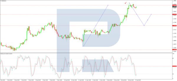 On the H1 chart, the pair completed its ascent to 1.1877 USD and is now forming a consolidation range below this level. A downward breakout is expected, with an initial decline towards 1.1762 USD likely. A brief rebound towards 1.1820 USD may follow. Selling pressure could then resume, with targets at 1.1630 USD and potentially 1.1550 USD. The Stochastic oscillator confirms this bearish near-term bias, with its signal line positioned below 50 and trending downward towards 20.