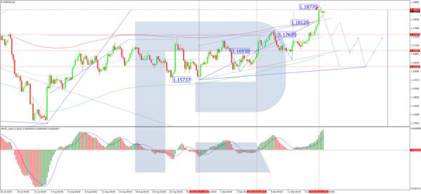 On the H4 chart, EUR/USD formed a consolidation range around 1.1762 USD before breaking upward to complete an impulsive move to 1.1877 USD. The pair now appears poised for a corrective decline towards 1.1762 USD. This outlook is supported by the MACD indicator: although the signal line remains above zero, it has reached overextended levels. This suggests that a near-term pullback is likely.