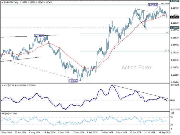 In the bigger picture, rise from 1.0176 (2025 low) is seen as the third leg of the pattern from 0.9534 (2022 low). 100% projection of 0.9534 to 1.1274 from 1.0176 at 1.1916 was already met. For now, further rally will remain in favor as long as 1.1390 support holds, and firm break of 1.2000 psychological level will carry larger bullish implications. However, firm break of 1.1390 will suggest that rise from 1.0176 has already completed and bring deeper fall to 55 W EMA (now at 1.1265) and below.