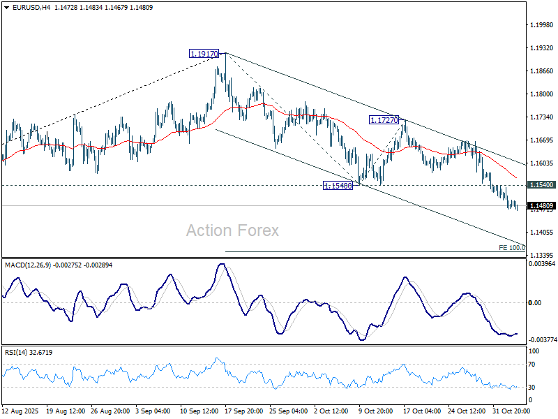 EUR/USD’s decline is in progress and intraday bias stays on the downside for 100% projection of 1.1917 to 1.1540 from 1.1727 at 1.1350. Decisive break there would prompt downside acceleration to 38.2% retracement of 1.0176 to 1.1917 at 1.1252. On the upside, above 1.1540 minor resistance will turn bias neutral and bring consolidations first, before staging another fall.