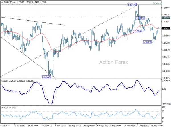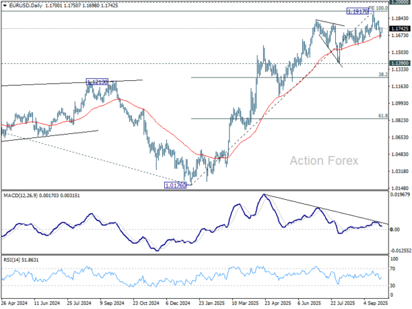 In the bigger picture, rise from 1.0176 (2025 low) is seen as the third leg of the pattern from 0.9534 (2022 low). 100% projection of 0.9534 to 1.1274 from 1.0176 at 1.1916 was already met. For now, further rally will remain in favor as long as 1.1390 support holds, and firm break of 1.2000 psychological level will carry larger bullish implications. However, firm break of 1.1390 will suggest that rise from 1.0176 has already completed and bring deeper fall to 55 W EMA (now at 1.1231).