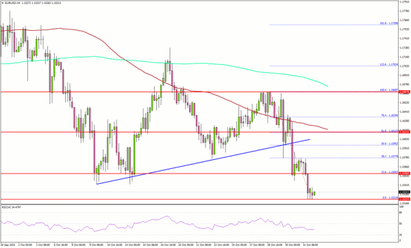 The Euro started another decline below 1.1620 against the US Dollar. EUR/USD traded below 1.1600 and 1.1580 to enter a bearish zone.