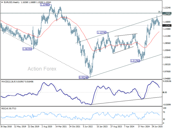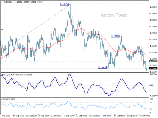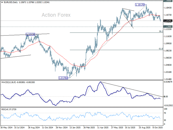 EUR/USD’s fall from 1.1917 resumed by late break of 1.1540 support. Initial bias stays on the downside this week for 1.1390 support, or even further to 38.2% retracement of 1.0176 to 1.1917 at 1.1252. On the upside, above 1.1576 minor resistance will turn bias neutral and bring consolidations first, before staging another fall.