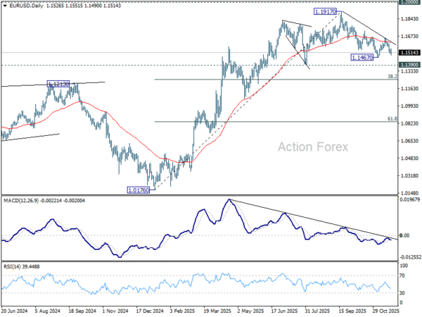 EUR/USD’s extended decline last week suggests that rebound from 1.1467 has completed at 1.1655. More importantly fall from 1.1917 high is not complete. Initial bias stays on the downside this week for 1.1467 first. Firm break there will target 1.1390, and then 38.2% retracement of 1.0176 to 1.1917 at 1.1252. On the upside, above 1.1551 minor resistance will turn intraday bias neutral. But risk will stay on the downside as long as 1.1655 resistance holds, in case of recovery.