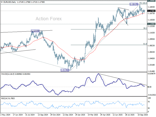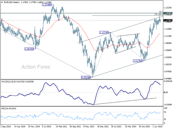 In the bigger picture, rise from 1.0176 (2025 low) is seen as the third leg of the pattern from 0.9534 (2022 low). 100% projection of 0.9534 to 1.1274 from 1.0176 at 1.1916 was already met. For now, further rally will remain in favor as long as 1.1390 support holds, and firm break of 1.2000 psychological level will carry larger bullish implications. However, firm break of 1.1390 will suggest that rise from 1.0176 has already completed and bring deeper fall to 55 W EMA (now at 1.1231).