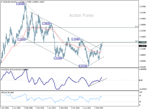 In the long term picture, 38.2% retracement of 1.6039 to 0.9534 at 1.2019, which is close to 1.2000 psychological level is the key for the outlook. Rejection by this level will keep the multi decade down trend from 1.6039 (2008 high) intact, and keep outlook neutral at best. However, decisive break of 1.2000/19, will suggest long term bullish trend reversal, and target 61.8% retracement at 1.3554.