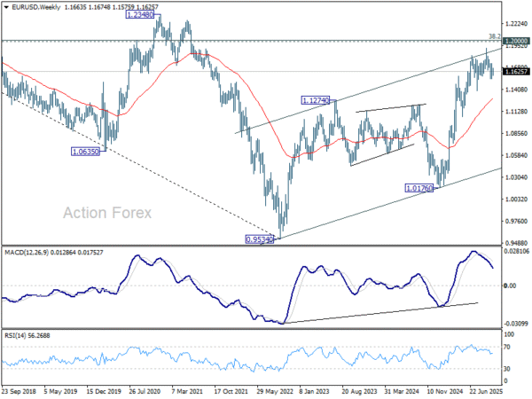 In the bigger picture, considering bearish divergence condition in D MACD, a medium term top is likely in place at 1.1917, just ahead of 1.2 key psychological level. As long as 55 W EMA (now at 1.1290) holds, the up trend from 0.9534 (2022 low) is still expected to continue. Decisive break of 1.2000 will carry larger bullish implications. However, sustained trading below 55 W EMA will argue that rise from 0.9534 has completed as a three wave corrective bounce, and keep outlook bearish.