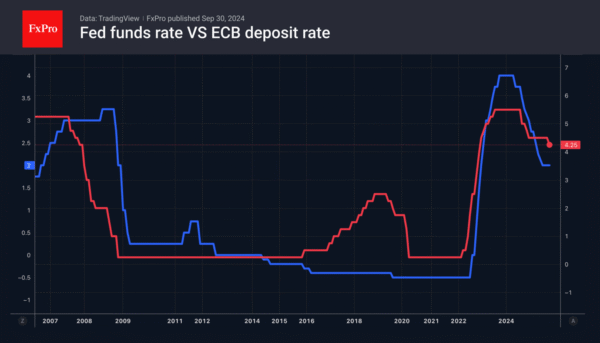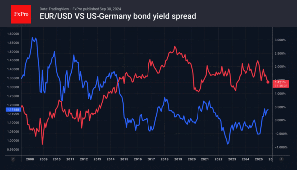 Jerome Powell and his colleagues are ready to rescue the cooling labour market and ignore accelerating inflation. As a result, the futures market gives a 91% probability of a cut in the fed funds rate in October and an 81% chance of another cut to 3.75% in December. Moreover, the derivatives estimate a 27% probability of a rate cut to 3.5% by the end of the year.