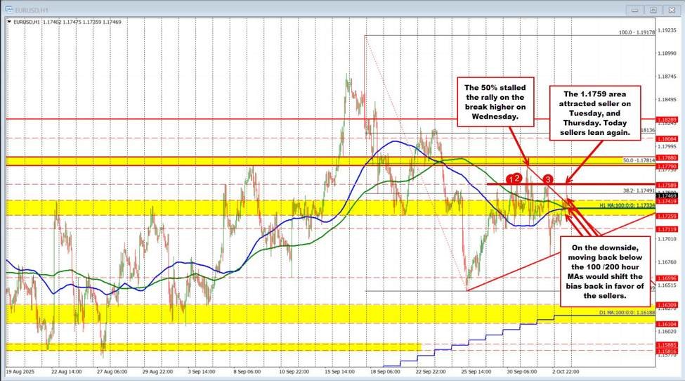 The EURUSD pushed higher in the US session, breaking away from the converged 100- and 200-hour moving averages and moving above both a downward trend line and the top of a key swing area at 1.17419. That break gave buyers added confidence and fueled a run to the topside, where the pair briefly extended above the 38.2% retracement of the decline from the September high at 1.1749.