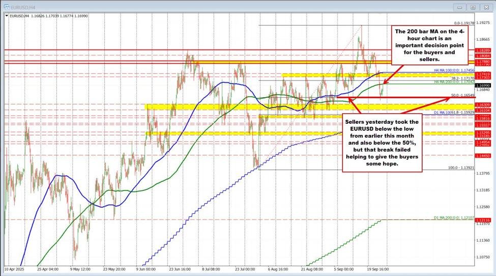 The rally has now carried the pair right into a key upside target: the 200-bar moving average on the 4-hour chart at 1.17042. The market tested that level moments ago, with the high price touching 1.1704, before easing slightly back to around 1.1696.