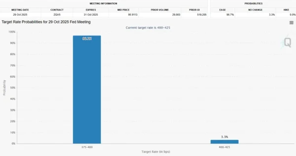 In light of these figures, market expectations for monetary policy have shifted significantly. Investors are now pricing in an almost certain 25-basis-point rate cut at the Fed’s next meeting. Moreover, the probability of a second cut in December has increased — particularly since a potential federal government shutdown could prevent the release of additional inflation data before year-end, making the September report even more crucial.