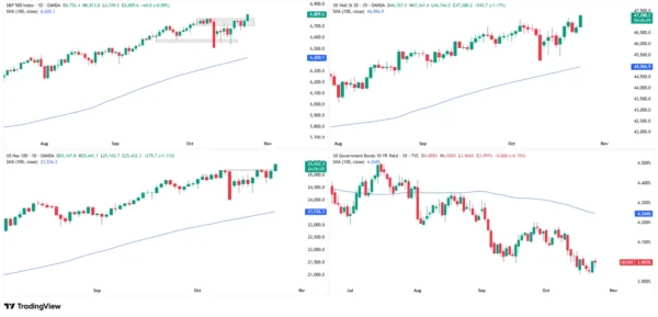 Daily chart of SP500, Dow Jones, NASDAQ100 and US10 yields, source: TradingView