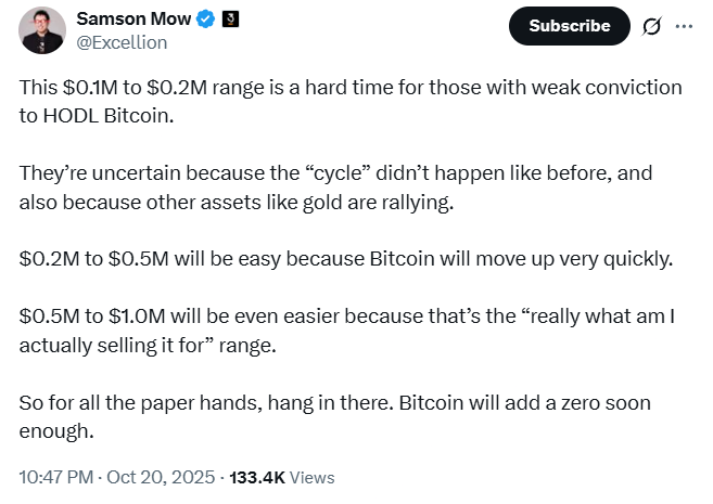 “This $0.1M to $0.2M range is a hard time for those with weak conviction to HODL Bitcoin,” the Jan3 CEO, Samson Mow, wrote in a Monday X post, adding: