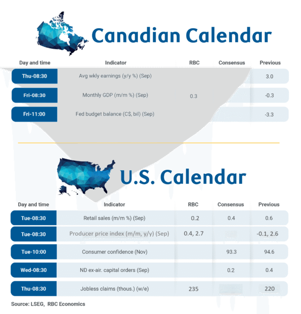 Next Friday’s Q3 gross domestic product appears backloaded with (what we expect will be) a 0.3% bounce-back in September after a surprise 0.3% contraction in August. That is firmer than the 0.1% preliminary estimate from Statistics Canada, but consistent with further acceleration in growth in Q4.
