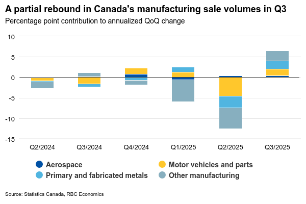 Overall, early indicators for monthly September GDP have been positive. Manufacturing sales volume jumped 2.7%—the largest one-month increase since January 2023. Oil production increased almost 3% in September by our estimates, and is on track to add positively to Q3 GDP growth after wildfires and maintenance related disruptions dampened oil sands production in Q2.