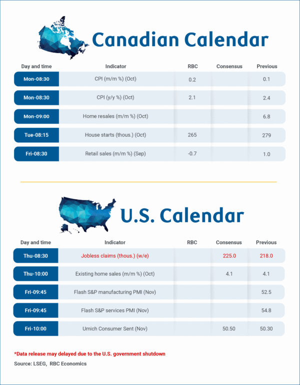 Next week’s Canadian economic calendar includes important releases on Canada’s household spending and inflation backdrop. October CPI data will likely be the primary focus, with housing starts and resales also set for release on Monday and September retail sales (and the advance estimate for October) to follow on Friday.