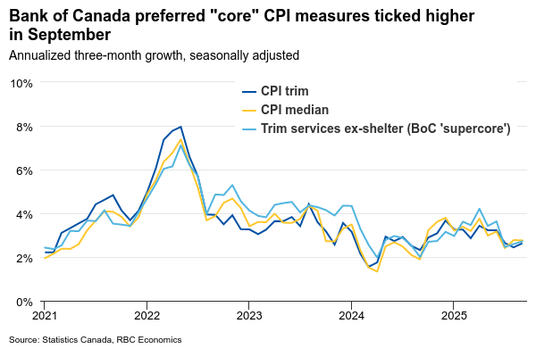 Headline CPI growth continues to be distorted on the downside by the removal of the cabon tax from energy products in most provinces in April. Broader measures of ‘core’ inflation are expected to remain above the Bank of Canada’s 2% target rate in October. We look for the price growth excluding food and energy products to hold at a 2.4% year-over-year rate. CPI-trim and CPI-median measures should hold around a 3% year-over-year rate.