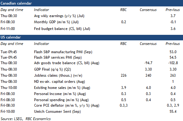 Our tracking for GDP growth in early Q3 is not significantly different than the BoC’s, but its decision to cut again (or not) in October will depend heavily on early October trade and labour market data, as well as the results from the BoC’s Business Outlook Survey.