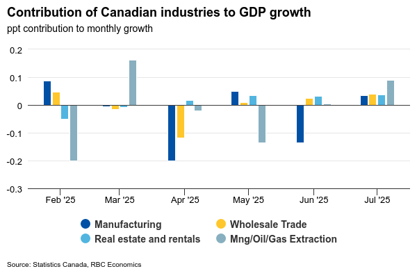 We expect GDP to post a 0.2% increase in July, modestly surpassing Statistics Canada’s preliminary estimate of a 0.1% rise. This would mark a welcome rebound following three consecutive months of declines.