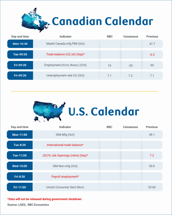 The U.S. government shutdown continues to prevent the release of key economic data with the coming week’s U.S. September international trade and October jobs reports unlikely to be published on schedule.